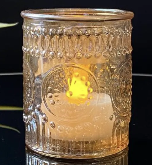 Material: vidrio labrado color ambar - Alto: 6.5 cm - Diametro: 5.5 cm Paquete de 12 piezas